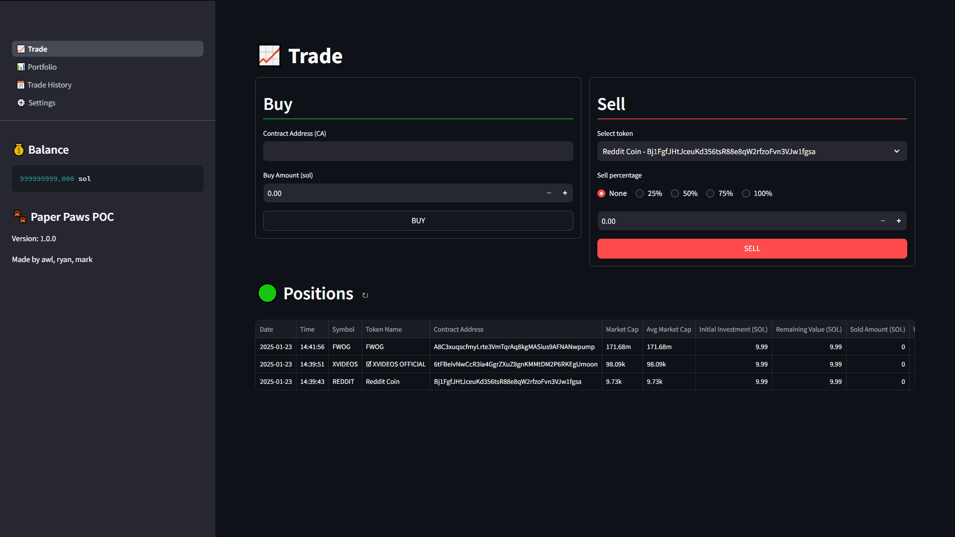 Simulate and monitor trades with live token prices, market cap data, and detailed metrics